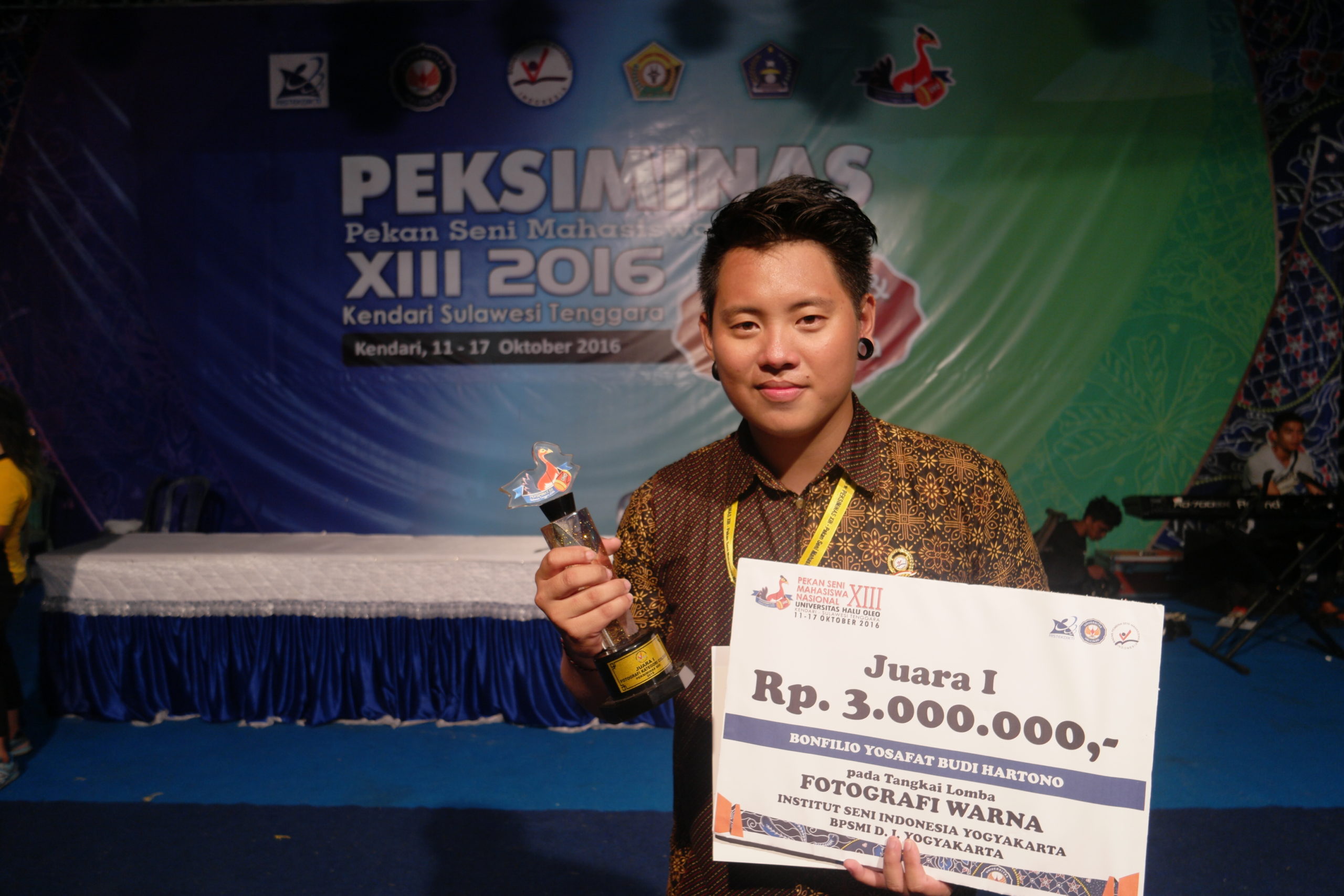 Berbekal kamera Mirror Less, Bonfilio Yosafat Budi Hartono mahasiswa jurusan Fotografi angkatan 2015 Fakultas Seni Media Rekam ISI Yogyakarta salah satu dari kontingen DIY berhasil meraih medali emas di ajang Pekan Seni Mahasiswa Nasional (Peksiminas) XIII tahun 2016.