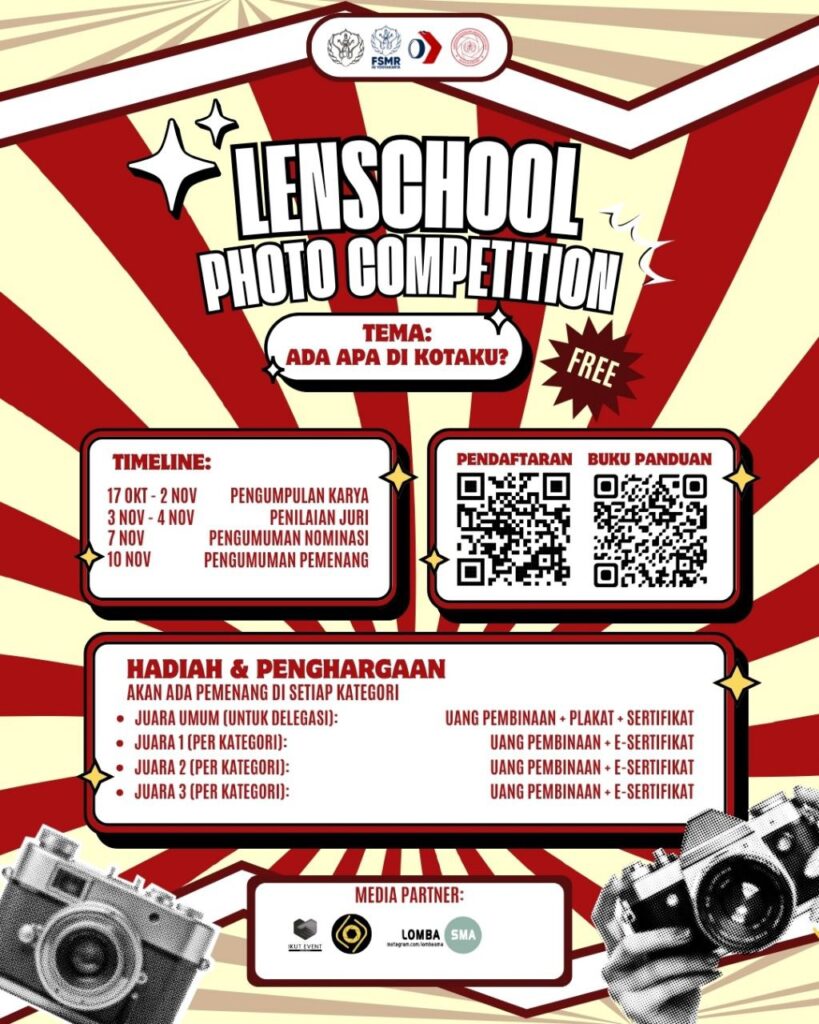Lenschool 2025 akan berlangsung mulai 17 Oktober hingga 2 November 2025, dengan total hadiah sebesar Rp2.000.000 serta e-sertifikat bagi pemenang lomba. Kegiatan ini mendapat dukungan penuh dari Program Studi Fotografi ISI Yogyakarta dan Fakultas Seni Media Rekam.