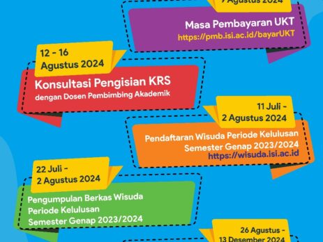 Selain itu, periode 11 Juli – 2 Agustus 2024 ditetapkan sebagai masa pendaftaran wisuda untuk lulusan Semester Genap 2023/2024. Pendaftaran dapat dilakukan secara daring melalui laman https://wisuda.isi.ac.id. Sementara itu, pengumpulan berkas wisuda dijadwalkan pada 22 Juli – 2 Agustus 2024.