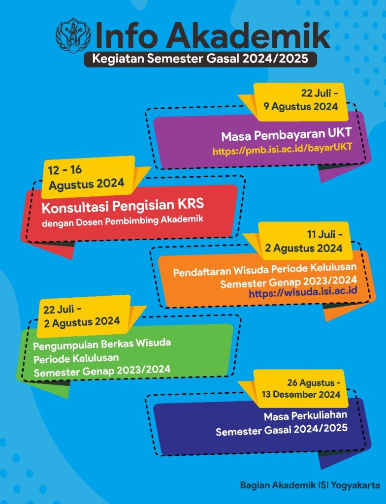 ISI Yogyakarta melalui Bagian Akademik merilis informasi penting terkait rangkaian kegiatan akademik Semester Gasal Tahun Akademik 2024/2025. Informasi tersebut mencakup jadwal pembayaran UKT, konsultasi pengisian KRS, hingga masa perkuliahan.