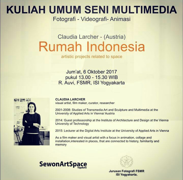 Pada hari Jumat, 6 Oktober 2017 di ruang AUVI FSMR Program Studi Fotografi bekerjasama dengan Sewon Art Space menghadirkan Claudia Larcher, dosen, seniman, sineas, kurator, dan Peneliti dari Austria untuk memberikan Kuliah Umum Seni Multimedia.