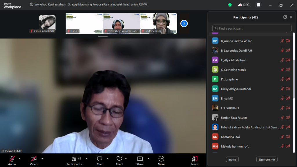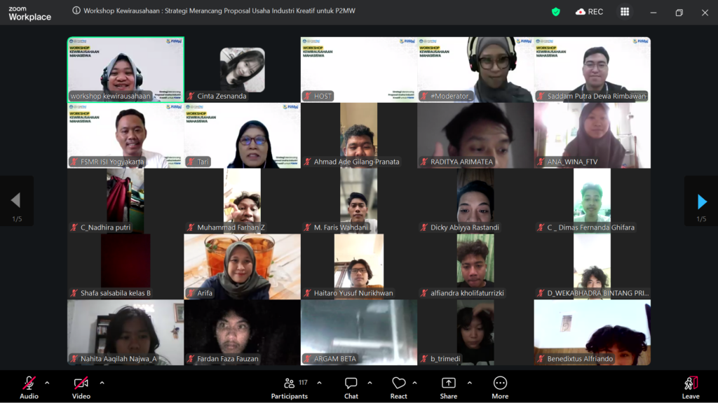 Yogyakarta, 16 Maret 2026 – Institut Seni Indonesia Yogyakarta mengadakan Workshop Kewirausahaan dengan subtema strategi merancang proposal industri kreatif P2MW. Workshop ini diselenggarakan melalui platform zoom pada pukul 13.00 s.d 15.00. Narasumber workshop ini adalah alumni penerima P2MW 2025 – Artamotion, Saddam Putra Dewa Rimbawa, S.Sn